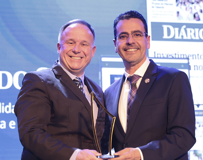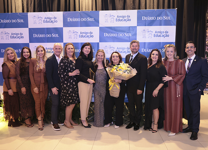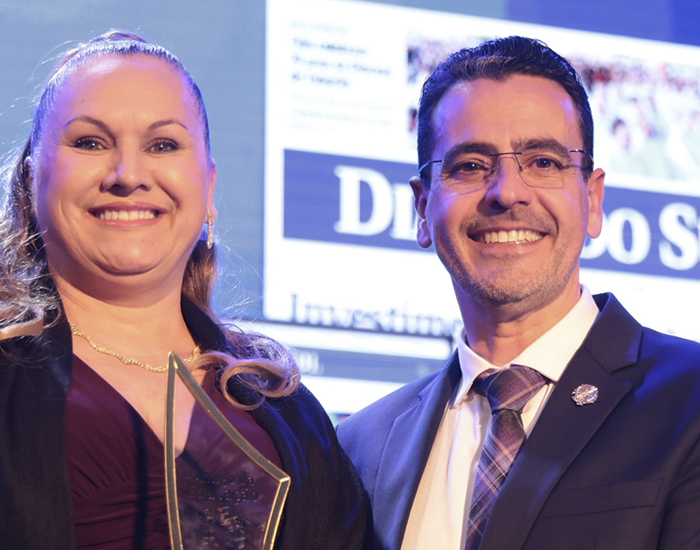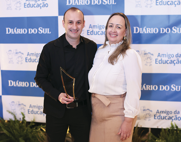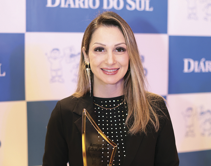 A farmacêutica e pesquisadora Fabiana Schulter Trevisol recebendo o Prêmio Amigo da Educação.