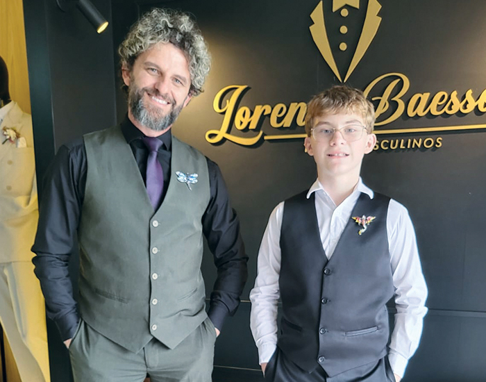 Em alto estilo, o comerciante Emerson Baesso e o filho, Lorenzo, posam para esta foto especial. Nas horas vagas, o garoto acompanha o pai na concorrida empresa de aluguel de trajes masculinos, localizada em Tubarão. Que dupla!
