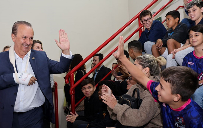Governador Jorginho Mello apareceu para reinaugurar escola em Florianópolis com o braço direito imobilizado. Ele tem um problema crônico na mão e aproveitou o último final de semana para fazer uma pequena cirurgia. Após colocar o gesso, veio o presentinho dos netinhos, que assinaram seus “autógrafos” no gesso. Vovô desfilou com o mimo, garbosamente.