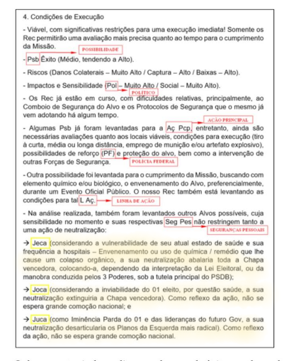 Há partes estupefacientes, como o da foto acima. Neste documento, por exemplo, o detalhamento de como Lula, Alckmin e Alexandre de Moraes seriam assassinados. Tudo referendado pelas delações de Mauro Cid e com provas de que tal documento fora impresso no Palácio do Planalto e levado ao Palácio da Alvorada para que Bolsonaro tomasse conhecimento.