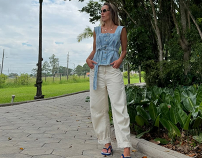 Na foto, ela posa com o look feito pela marca que administra e que vem ocupando espaço nos guarda-roupas mais antenados da região.