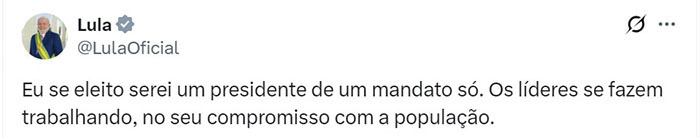 Para contribuir com tudo o que escrevi sobre a inviabilidade de Lula no ano que vem, trago uma promessa que ele mesmo fez na plataforma X, antigo twitter, no dia 25 de outubro de 2022.