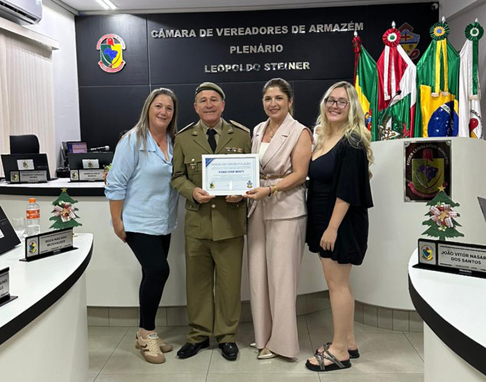 O subtenente da Polícia Militar Fábio José Berti foi homenageado pela Câmara de Vereadores de Armazém com uma Moção de Congratulação em reconhecimento aos seus 34 anos de dedicação à segurança pública. A proposta foi apresentada pela presidente da Casa, vereadora Andresa Machado da Silva, e aprovada por unanimidade pelos demais vereadores. A comenda reconhece sua trajetória exemplar, marcada por coragem, disciplina, profissionalismo e profundo compromisso com a comunidade. O subtenente Fábio também é destaque como o segundo policial mais antigo em atividade no estado de Santa Catarina — uma marca rara, que evidencia sua vocação e resistência ao longo da carreira. A homenagem foi acompanhada por familiares e colegas da corporação, em um momento de emoção e gratidão pelo legado deixado à Polícia Militar e à população de Armazém.