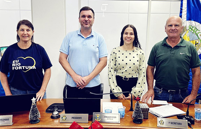 A atual mesa diretora da Câmara de Vereadores de Rio Fortuna seguirá inalterada em 2026. Na sessão ordinária desta semana, foram reeleitos Fernando Ricken como presidente e Nivalda Feldhaus como vice-presidente. Os secretários também permanecem os mesmos: Heloísa Heidemann Wiggers e Valdeci Dela Justina. Em seu discurso, o presidente reeleito Fernando Ricken destacou a harmonia entre as bancadas de situação e oposição ao longo do ano. “Mesmo com divergências em alguns temas, todas as matérias tramitaram normalmente, com foco no bem-estar do cidadão riofortunense”, afirmou. As sessões ordinárias retornam no dia 3 de fevereiro.