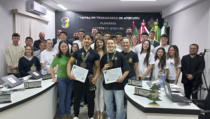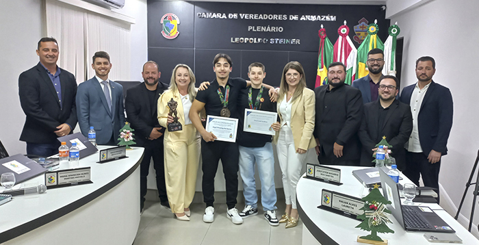 Os jovens atletas de fisiculturismo Cauã José Cardoso e Angel Wensing dos Santos foram homenageados pela Câmara de Vereadores de Armazém com uma Moção de Congratulação, proposta pela vereadora Andresa Machado da Silva e aprovada por unanimidade pelos demais edis. A comenda reconhece suas trajetórias, marcadas por determinação, fé, disciplina e amor ao esporte, refletidas nas importantes conquistas alcançadas na modalidade do fisiculturismo. Ambos representam com orgulho o município de Armazém, tornando-se inspiração para a juventude e exemplo de superação. A cerimônia foi prestigiada por familiares, colegas de escola, professores, autoridades e treinadores, reforçando a importância do incentivo ao esporte e à saúde entre os jovens.