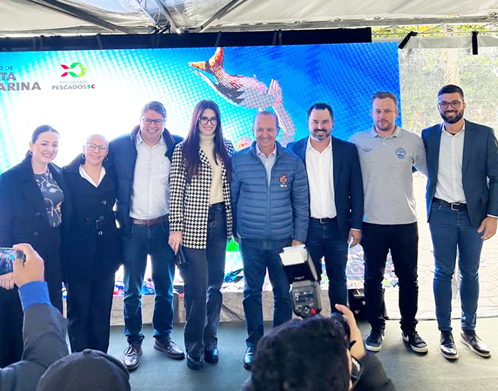 A comitiva de Armazém, liderada pelo vice-prefeito Guilherme Penacho, marcou presença no lançamento do Programa Pescados SC, realizado em Florianópolis pelo governador Jorginho Mello. Representando os produtores de tilápia da região, estiveram no evento o aquicultor Mário Wensing (Marico), seu filho Tiago Wensing e também participaram o vereador Muriel da Rosa, os suplentes Cristiano Joaquim, Karina Zanellato e Renata da Rosa, e ainda a secretária de Assistência Social, Adriana Neves Fraga. O Pescados SC é o maior conjunto de ações já promovido para fortalecer a pesca e a aquicultura, com R$ 100 milhões em investimentos. Como “Capital Catarinense da Tilápia”, Armazém busca fazer parte desta iniciativa do governo.