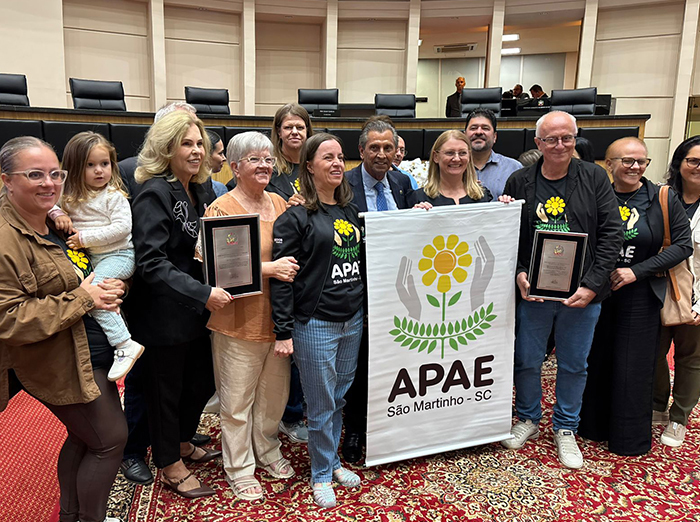 Alesc celebrou em sessão especial os 20 anos da Lei das Apaes, de autoria do deputado Julio Garcia, em 2005, e prestou homenagens às instituições e lideranças do movimento. Entre as personalidades homenageadas pelo destaque em defesa das Apaes em suas regiões, a vereadora e ex-prefeita de São Martinho, Leonete Back Loffi, que estava acompanhada da diretora Patrícia Eyng Fernandes, funcionários, professores e uma das alunas da Apae.