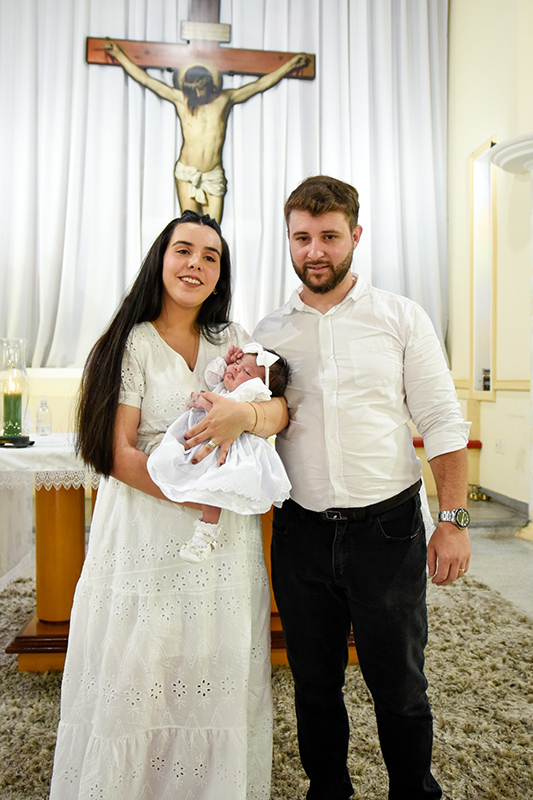 Tereza Maria no colo dos papais, Marian e Felipe, recebendo a bênção de Deus em seu batizado.
