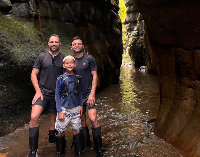 Os queridos e sempre lindos Davi Goulart (nosso editor-chefe aqui do DS), Felipe Cascaes e o filhão superparceiro Pietro curtindo férias mais que merecidas com roteiro dos mais especiais, cheio de aventuras. Aqui, na Trilha Rio Túnel, no pé da Serra Corvo Branco.