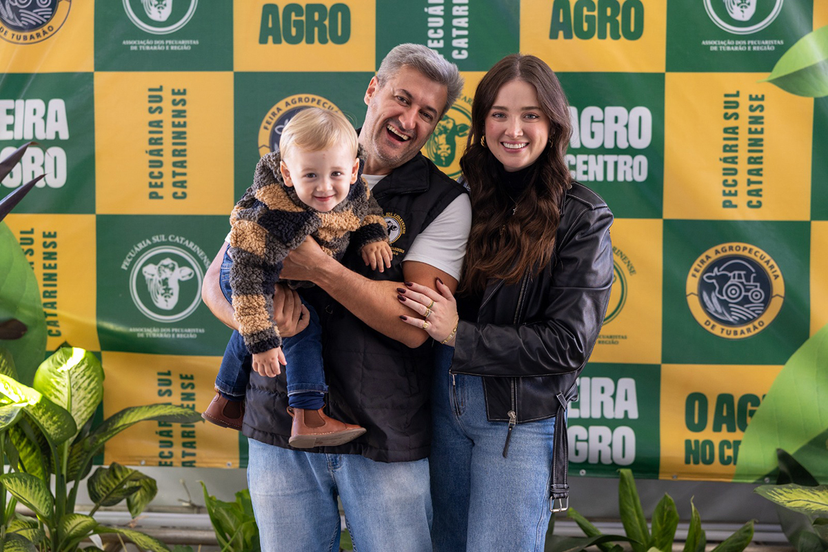 Djalma Figueiredo, presidente da Associação de Pecuaristas de Tubarão e Região, ao lado da esposa, Mariane Nunes Feitosa, e do filho, Joaquim, celebrando o sucesso da 7ª Feira Agropecuária de Tubarão.