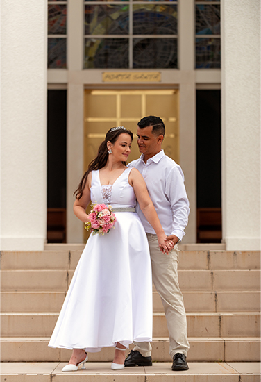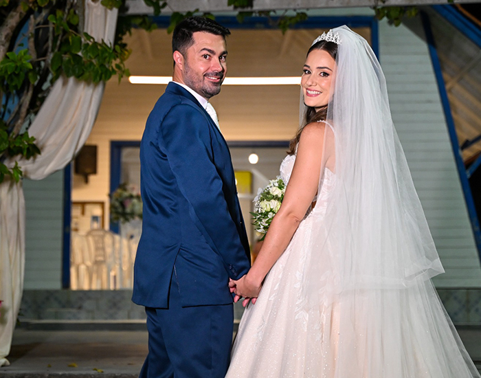 Os olhares e sorrisos traduzem a felicidade do casal Guilherme e Tuane após o sim!