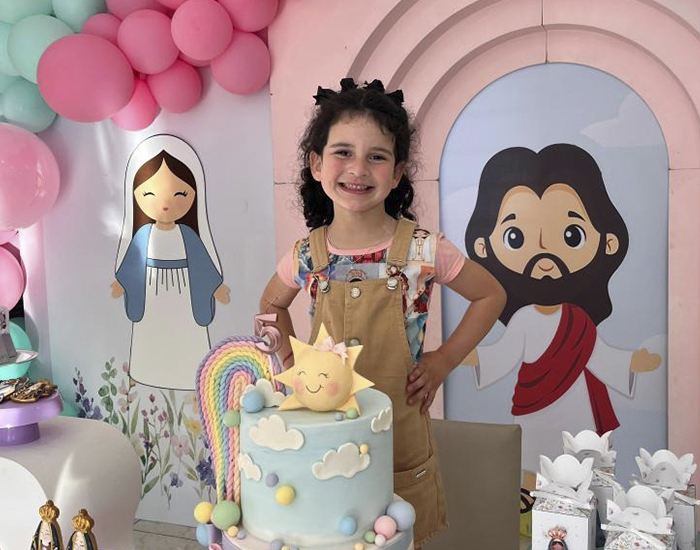 A pequena Helena ganhou a festinha em comemoração aos seus cinco aninhos do jeitinho que ela queria... com decoração linda e abençoada de Jesus e Nossa Senhora... Belo exemplo de demonstração de fé infantil.