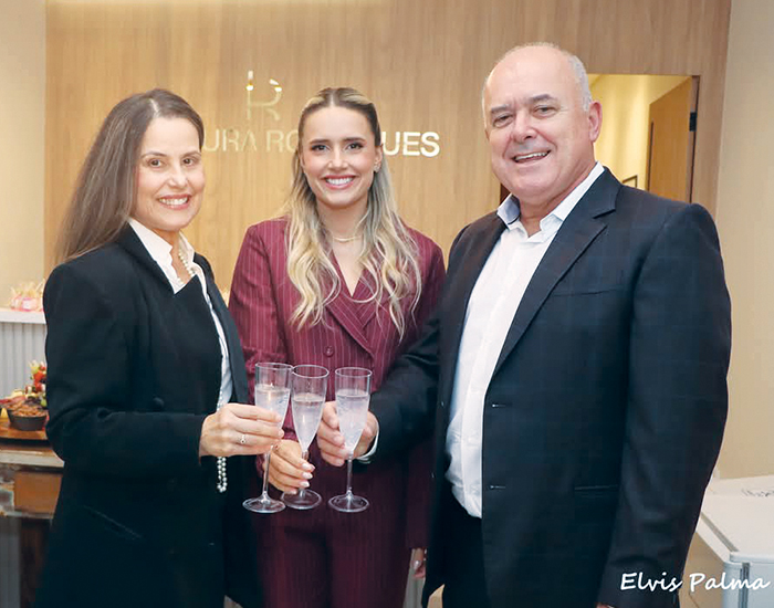 A dentista Laura Rodrigues de Souza brindando a inauguração do seu consutório em Laguna, junto dos pais, Túlio e Vera.