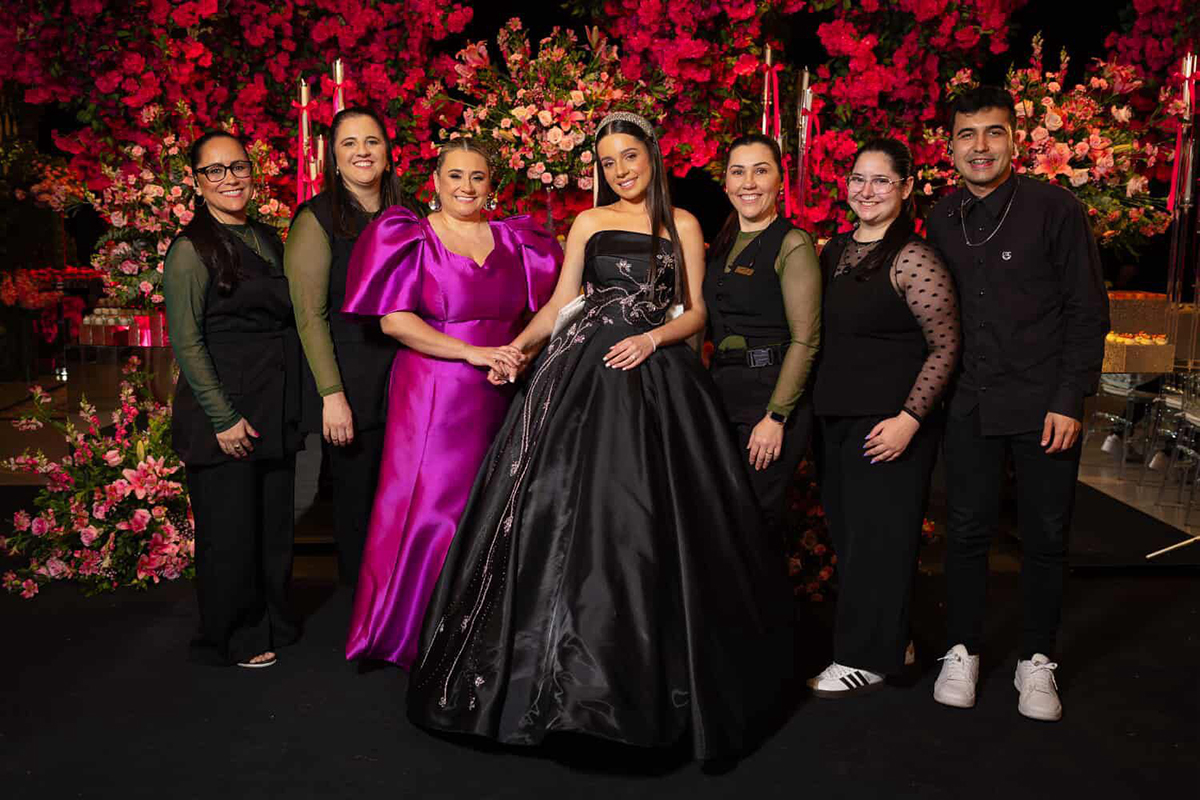 Rafaela Scandolara Quirino comemorou seus 15 anos com uma festa linda e aparece aqui, como uma princesa, com a mãe, Carla Scandolara Quirino, e a super equipe da Kellen Mendes Cerimonialista.