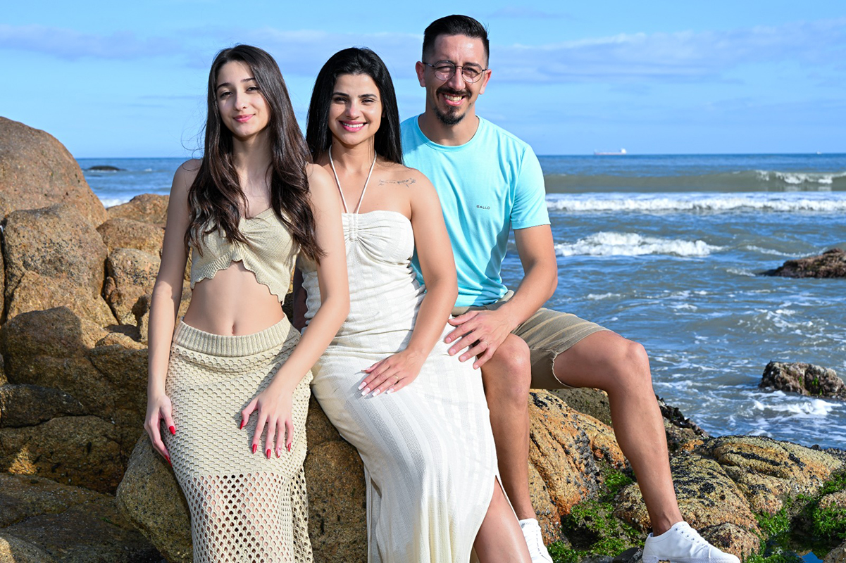 Isabele, Joice e Diogo em foto iluminada em clima de verão, na Praia do Rosa.