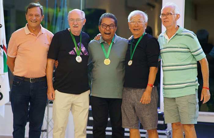 Jovem, quando se depara com idosos, não vislumbra que um dia fará parte. No último final de semana coube-nos participar do 3º Encontro de aposentados e pensionistas de auditores fiscais catarinenses, promovido pela Affesc, com patrocínio do Sindifisco. Felizes pelos reencontros de amigos e familiares, onde a motivação em participar, individual ou coletivamente, superou as consagrações pelos resultados. Guindados ao cerimonial de seleto grupo, onde alguns nos dirigiram em funções superiores, a satisfação em contribuir no evento em que os que nos sucedem deveriam se espelhar, portanto convidados aos próximos. E, como participante, o título na sinuca, apenas para ilustrar com os amigos em foto. Ari (presidente), Inácio, este colunista, Kirita e Brani.