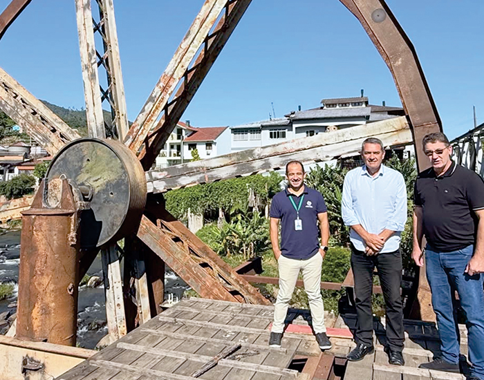 O prefeito de Pedras Grandes, Agnaldo Fillipi, recebendo o diretor-executivo da Amurel, Celso Heidemann, no novo cartão-postal da cidade, a roda d’água metálica.