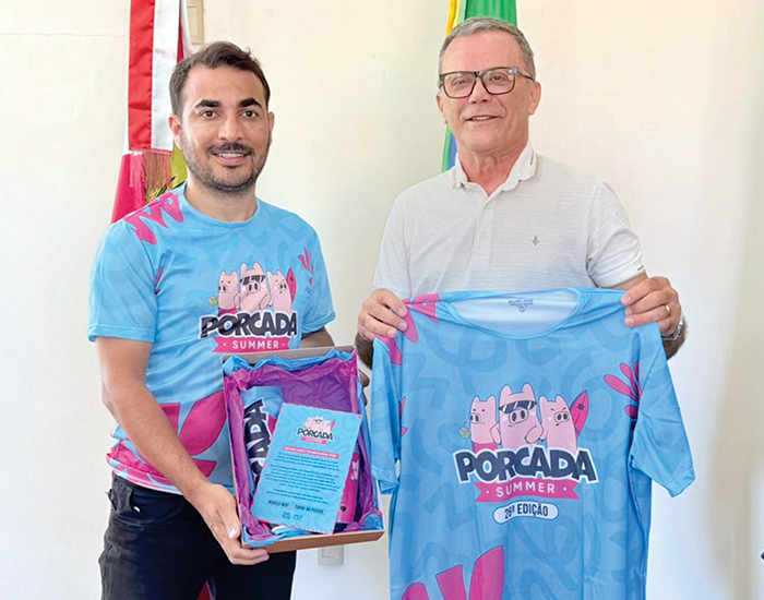 O amigo Maycom Maurício, um dos organizadores da Porcada Summer 2026, visitando o prefeito de Capivari de Baixo, Claudir Bitencourt, para convidá-lo para a grande festa, que acontece neste sábado, em Laguna.