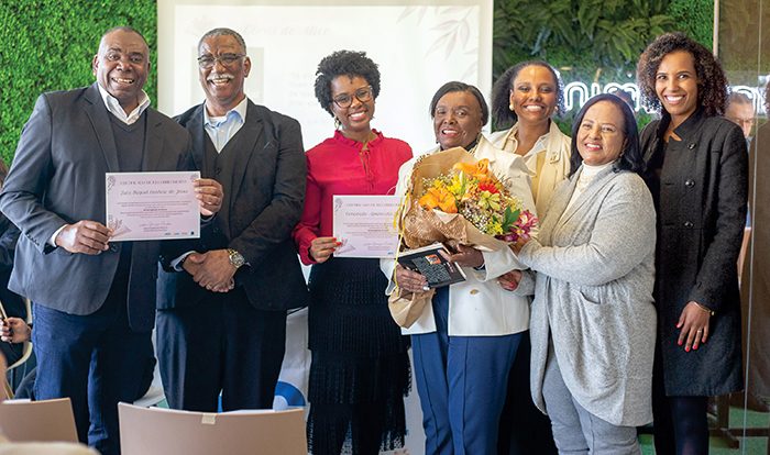Os organizadores do projeto Entre Versos e Memórias, homenageando os filhos da poetisa Alice Cardoso de Jesus, Miguel e Conceição.