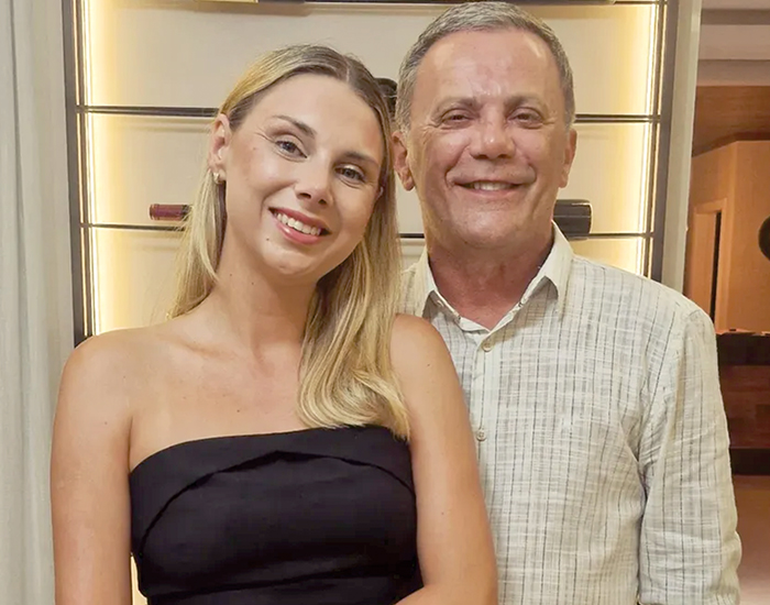 A primeira dama de Capivari de Baixo, Thayse Izidro, ainda celebrando o aniversário, recebendo o carinho do marido,