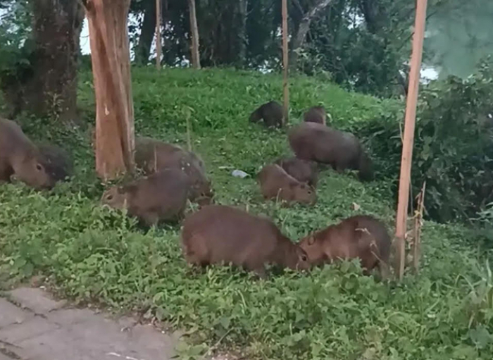 Estávamos andando tranquilos, de boa, quando de repente vi um movimento na água e já fiquei de orelhas em pé. Pensei logo que era um tubarão bem grandão e saí correndo. Mas minha humana é curiosa e quis chegar mais perto. E não é que a gente encontra uma família completa de capivaras! Isso mesmo, capivaras! Tinha o pai, a mãe, os filhotes... até o vô e a vó.