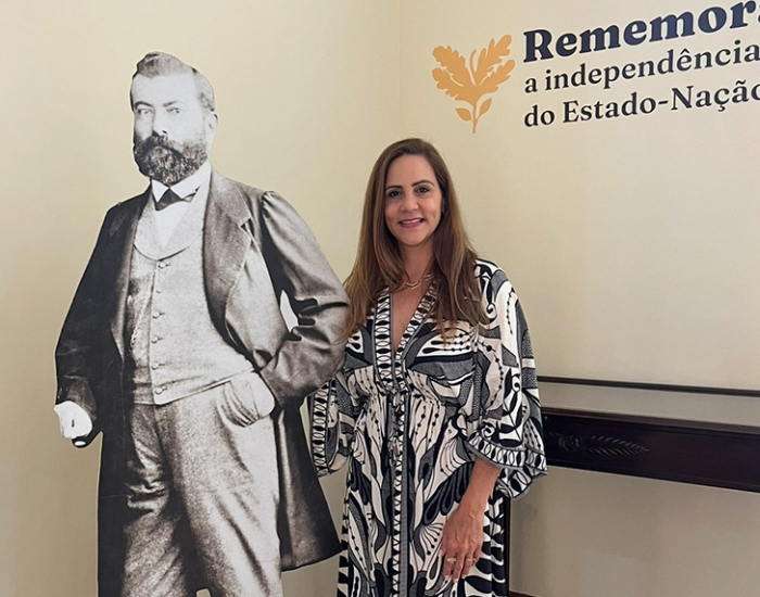 Logo ali, um tótem em tamanho real de Mariano Procópio nos recebeu. Entusiasmada, pedi para minha irmã registrar uma foto minha abraçando o homenageado. Dentro da casa, a atmosfera do século XIX se fazia presente em cada detalhe — móveis, lustres, molduras. Um ambiente que já foi morada da família Procópio e até hospedou a família imperial em visita à cidade.