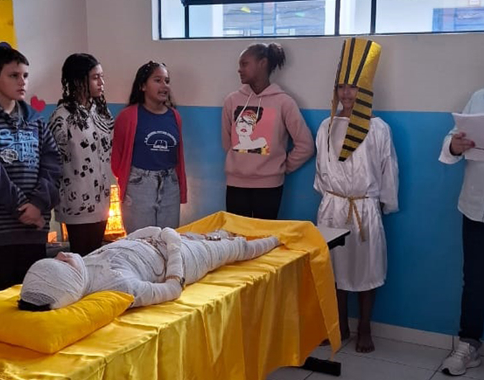 Os alunos, junto com a professora Maria Salete de Fáveri Brillinger, fizeram uma simulação de mumificação dos faraós do Egito antigo.