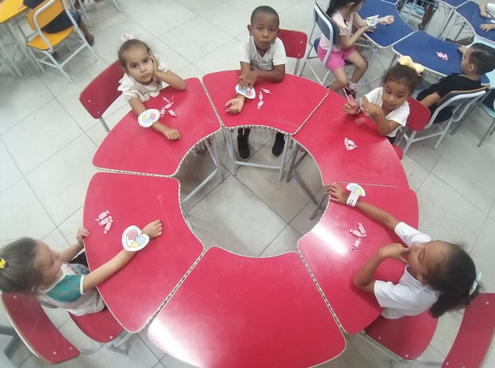 Com pedaços de papel crepom colorido, cada aluno enfeitou um coração e, posteriormente, ganhou um bracelete alusivo à data.