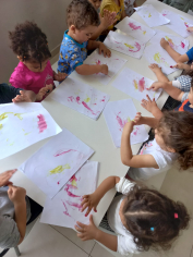 Para descobrir como eram feitas as tintas que os indígenas usavam para pintar o corpo, a turma do maternal I do CEI Pedra Santos de Souza, de Capivari de Baixo, realizou uma atividade diferente. A unidade escolar está trabalhando este mês o tema “Povos Originários”.