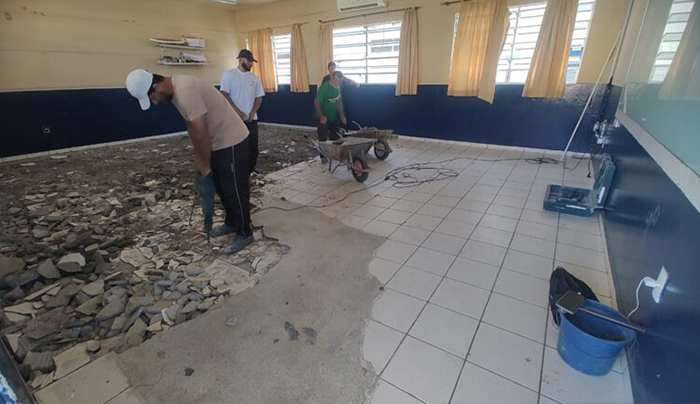 De acordo com o diretor do setor, Pedro Sá, o piso das salas havia cedido e apresentado rachaduras, provocando desnivelamento e risco para o uso diário. Por isso, foi necessário remover toda a estrutura antiga e reconstruir o espaço com novos materiais, garantindo maior resistência. “Refizemos o contrapiso, aplicamos cerâmica nova e estamos revitalizando completamente os ambientes, inclusive com pintura, para que os alunos retornem a salas seguras e renovadas”, afirmou.