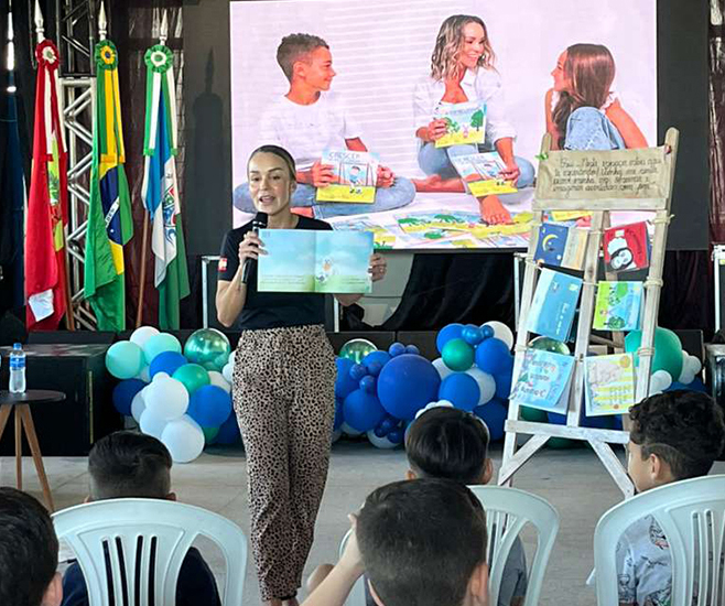 A autora apresentou o livro “Dois em 1”, obra que reúne duas narrativas inspiradas em experiências familiares e que trazem mensagens sobre coragem, determinação e superação. A primeira, “Crescer, um Ato de Coragem”, foi baseada na história de seu filho prematuro e aborda, de forma leve, o enfrentamento de desafios ligados à saúde e ao amor pelo futebol. Já “A Estrelinha, uma História sobre Determinação” retrata a persistência de sua filha Maria Clara em aprender a fazer estrelinhas, mostrando a importância de não desistir diante das dificuldades.