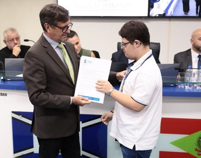 O estudante e atleta Aislan Júnior, de 15 anos, foi homenageado na Câmara de Vereadores de Tubarão durante a sessão da última segunda. O ato ocorreu após o pedido de uma moção realizada pelo vereador Nilton de Campos (PL), dois dias após a participação do jovem no Campeonato Meeting Paralímpico Loterias Caixa 2025 – Seletiva Paralimpíadas Escolares, em Florianópolis.