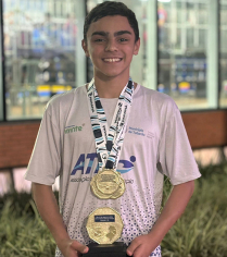 Agora, aos 13 anos, o garoto vem se destacando na modalidade e conquistando premiações importantes. Só no Campeonato Sul-Brasileiro de Clubes Infanto/Juvenil, realizado em Colombo, no Paraná, ele ganhou quatro medalhas de ouro.