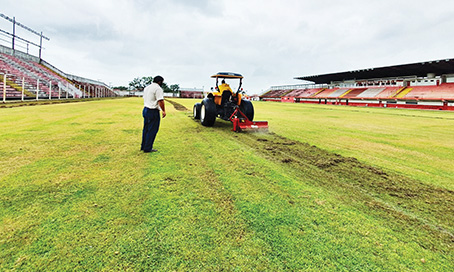 Durante a manhã, iniciou o corte vertical, com o intuito de retirar toda a matéria orgânica que se acumula com o tempo embaixo da grama, e que não é benéfica para a qualidade do campo.