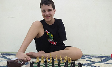Gustavo nasceu sem os braços e, segundo a mãe, o incentivo da família, dos amigos e dos colegas de escola motiva o adolescente a continuar se dedicando aos esportes da mente.
