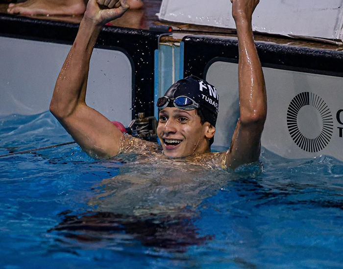 Matheus é um dos destaques da natação tubaronense e representa com orgulho o município, evidenciando o talento e a dedicação dos jovens atletas da região.