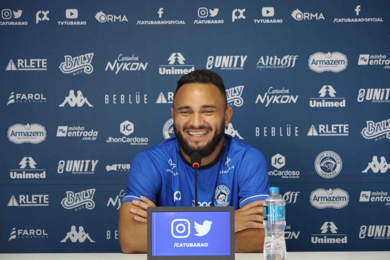 Autor do gol da vitória sobre o Fluminense de Joinville, na segunda-feira, o volante Rafinha Potiguar vibra com o seu primeiro gol com a camisa do Tubarão. O jogador, contratado para a Série B do Campeonato Catarinense, foi titular nas duas primeiras rodadas da competição vestindo a camisa 8.
