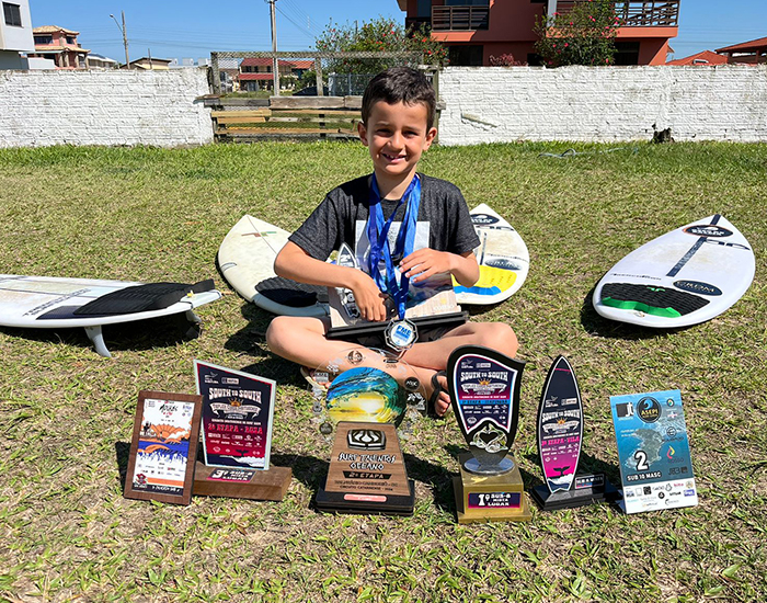 O surfista tubaronense João Eduardo Boppre Faust, de sete anos, tem muito o que celebrar neste final de 2024. Somente neste ano, ele subiu nove vezes ao pódio, participante de competições em praias de Santa Catarina e de outros estados brasileiros.