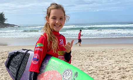 No último fim de semana, a jovem promessa do surfe trouxe para casa mais uma conquista: ficou em 1º lugar no pódio do campeonato da Taça Baleia França de Surf Open, categoria sub-10, realizado em Imbituba. “Seu grande sonho é ser campeã mundial e ela conta com muitos apoiadores para isso. Vemos que a garra dela incentiva muito as novas gerações”, descreve a mãe ao citar sobre a representatividade da filha no esporte.