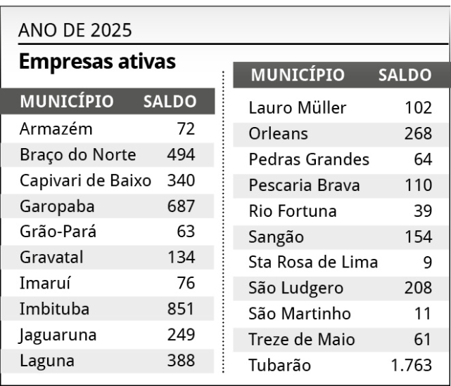 Santa Catarina bateu recorde de abertura de empresas em 2025. Entre janeiro e dezembro, o estado registrou 293 mil novos CNPJs e 153 mil negócios extintos, o que resultou no saldo positivo de 140 mil novas empresas, o maior volume da história em um ano. Na região, foram 6.143 novos negócios em 2025, 730 a mais do que no ano anterior – um aumento de 13,48%, superando até a média estadual.