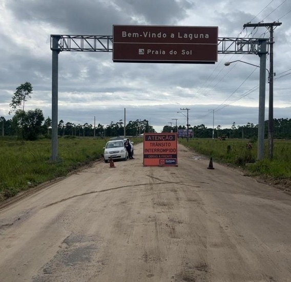 O trânsito à BR-101, no acesso à Praia do Sol, em Laguna, está interrompido devido às obras de pavimentação asfáltica do trecho, que precisa de reparos na tubulação da drenagem. A interrupção acontecerá até sexta-feira.