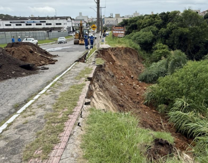 Um rompimento em uma adutora causou um desbarrancamento na lateral da Avenida Brasil, no bairro Paes Leme, em Imbituba. O problema levou à interdição do trânsito próximo ao trevo de acesso à via, no sentido Vila Nova–Centro.