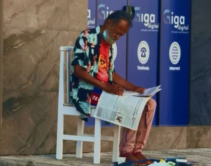 Sentado em uma cadeira simples na calçada da Travessa Miguel Souza Reis, nas proximidades do Hotel OK, no Centro de Tubarão, o senhor José Arilton Gomes, de 73 anos, chama a atenção de quem passa não apenas pela condição de vulnerabilidade social em que vive, mas principalmente pelo hábito que preserva: a leitura diária do DS.