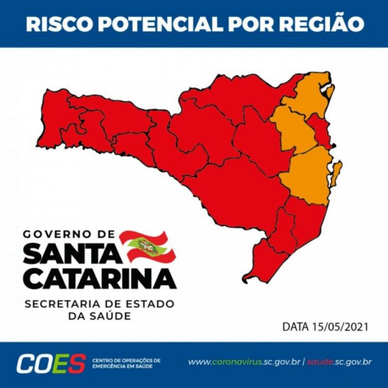 A Matriz de Risco Potencial divulgada hoje pela Secretaria de Estado da Saúde (SES) aponta que três regiões de Santa Catarina foram classificadas no patamar grave (cor laranja) e outras 13 na situação gravíssima (cor vermelha), incluindo a Amurel, para a transmissão da covid-19.