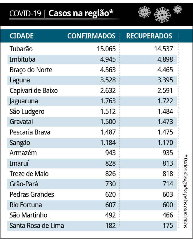 Até ontem, a região contabilizou 43.047 casos confirmados de covid-19 desde o início da pandemia. Destes, 42.034 pacientes estão curados e 493 morreram. Com isso, até o momento, há na Amurel 520 pessoas com o vírus ativo, em monitoramento ou internadas nos hospitais.