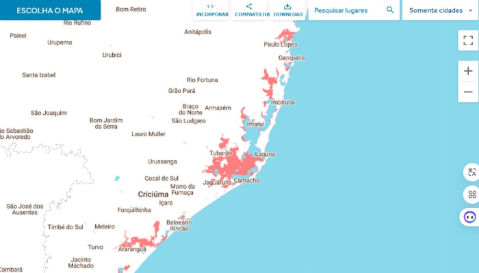 Em Laguna, de acordo com a ferramenta, a região na Bifurcação e no bairro Estreito seriam os mais afetados. Em Imbituba, as inundações ocorreriam próximo a Sambaqui, Riacho Ana Matias e nas imediações da Lagoa de Imaruí.