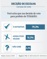 O levantamento também apresentou o índice de rejeição dos candidatos a prefeito de Tubarão. Os eleitores foram questionados sobre em quem eles não votariam de jeito nenhum. A candidata Maristela Francisco (PT) obteve o maior índice de rejeição, com 42,4% das respostas. Estêner Soratto (PL) apresentou o segundo maior índice, com 27,1%. Já o candidato Carlos Stüpp obteve a menor rejeição na pesquisa, ficando com 18,7% das respostas.