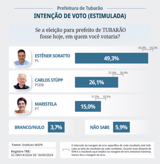 O candidato Carlos Stüpp (PSDB) encabeça a coligação “Para Tubarão voltar a sorrir” (Federação PSDB/Cidadania/PP/Solidariedade/PRTB), com Dr. Jean Machado como vice. Estêner Soratto da Silva Júnior (PL) está à frente da coligação “Um novo tempo”, ao lado do candidato a vice-prefeito Denis Matiola (PSD). Além do PL e PSD, a coligação conta com os partidos União, MDB, PRD, Podemos e Republicanos. Maristela Francisco (PT) lidera a Federação Brasil da Esperança, composta pelos partidos PT, PCdoB e PV com o Professor Paulão (PT) como vice. A pesquisa foi realizada com 406 eleitores, por telefone. Está registrada no Tribunal Regional Eleitoral sob o protocolo Nº SC-04014/2024.