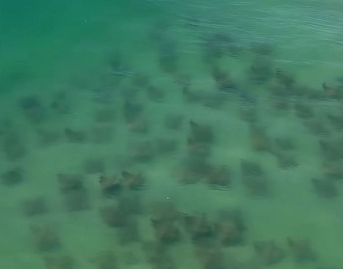 Um expressivo cardume de arraias foi avistado nadando próximo à Prainha do Farol de Santa Marta, em Laguna. As imagens chamaram a atenção de moradores e visitantes ao mostrarem mais de uma centena de animais reunidos em águas rasas, muito próximas da beira da praia.