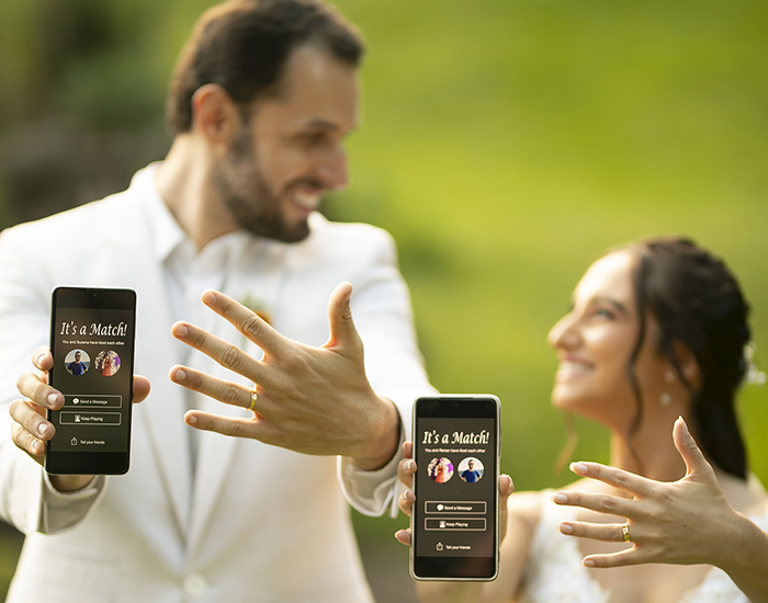 Para eternizar a história do casal, o fotógrafo Gilmar Estevam Júnior, sabendo do relato de Suzana e Renan, enquanto fazia as fotos da cerimônia do casamento deles teve uma ideia: “Não poderia deixar esse momento de fora. Me chamou a atenção o fato deles se conhecerem no aplicativo. Dei a ideia das fotos com o celular mostrando o match no Tinder e toparam”, descreve.